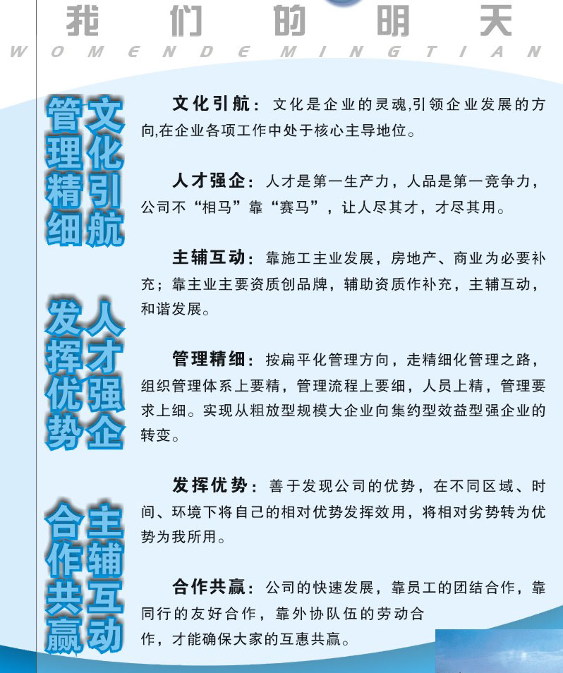 3、企業(yè)文化是公司持續(xù)發(fā)展的迫切需要,是公司樹形象、創(chuàng)品牌、提升知名度的必要手段,是公司思想政治工作發(fā)揮作用的載體。